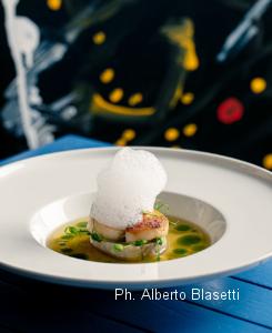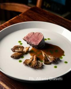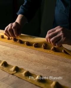 CUCINA GIAP-PARMENSE “Quando mio padre ha smesso di cucinare, si sono alternati diversi cuochi molto bravi, ma spesso troppo fissati sul proprio ego non riuscivano a capire l’essenza di questo posto” argomenta Mariella mentre recapita gli snack sfornati per l’occasio- ne. “Prima Daniele Lunghi, di formazione molto francese; poi Jacopo Malpeli, con una bella mano ma impostato sulla cucina fine dining. Infine, mi sono trovata a smanettare online per pescare un cuoco di nome Paco Zanobini, che dall’ex-Osteria del Teatro era finito a lavorare in India. Paco è stato un punto di riferimento per noi sino alla sua scelta di provare un percorso individuale, ma proprio grazie a lui abbiamo conosciuto Kuni”. Un intreccio fortuito e un po’ magico di contaminazioni e allineamenti umani, che ci concede portate pregne di maestria e talento. Al seguito dello start di Focaccia con patacotto (prosciutto cotto di Patanegra) e la Giapponiera (giardiniera all’orientale) atterrano antipasti da capogiro: Capasanta arrostita al millimetro in un persistente brodo simil-dashi e un piedistallo di tenera melanzana; Funghi porcini locali in tempura con una pungente salsa verde e gambuccio di prosciutto di Langhirano; o ancora una supersonica Melanzana fondente drappeggiata con crema di Parmigiano Reggiano e crumble di pomodoro dallo sconvolgente acuto mediterraneo. Per connetterci meglio alla mentalità di Kuni basta interrogarlo sul motivo che l’ha portato a fermarsi qui a Fragnolo. La sua pronta risposta? “Vino, campagna, perso- ne… e ancora il vino”. Lo chef del Sol Levante è di poche parole, ma ne assesta più in scioltezza quando degusta qualche etichetta stappata da Guido per l’occasione. Salta fuori che il suo background si articola tra una facoltà di architettura in Giappone e una manovalanza in cucina già da diciassettenne, per poi ritrovarsi a lavorare in diversi ristori e trattorie locali anche di cucina italiana. Brilla in lui l’amore per quella timbrica di piatti e si lancia alla scoperta di mezzo Stivale, maturando ga- vette e un passaporto gastro-culturale super ferrato sulle ricette regionali. Qualche intoppo dovuto al permesso di soggiorno rallenta il suo tragitto, fino al tramite con Zanobini che lo scorta nel ventre familiare di Mariella & Co. “Qui la dimensione è come in paradiso – aggiunge Kuni – vivo in mezzo ai boschi, in una torre che era la casa della zia di Mariella, Marisa” afferma indicando una stradina in salita che s’inoltra tra gli alberi. “Per me è un contesto stupendo, molto meglio della città. La cosa più importante che ho appreso cucinando qui è il rispetto per il cibo e per gli ospiti, quasi spirituale. Inoltre, sono sempre spronato a fare del mio meglio, perché quando mi confronto con i piatti tradizionali sono già ottimi e io non voglio stravolgerli. Posso fare variazioni sugli ingredienti, alleggerire i soffritti, sperimentare cotture o mettere un tocco orientale nei brodi, ma il gusto deve essere fedele all’es- senza della portata e ai prodotti dei fornitori, perché anche loro sono tutti amici”. A enfatizzarne il concetto ci pensa la sequenza di primi. Un atomico Tagliolino al nero – ammiccante alla soba per elasticità e temperatura – con suadente crema di man- dorle, finissime zucchine, coulis di pomodoro e gambero rosso crudo a infondere grassezze iodate. I conturbanti Cappellacci ripieni di caprino liquido (di una piccola casa- ra autoctona) permeati da un twist emolliente di cacio e pepe. Infine, gli iconici Anolini in brodo di manzo e gallina, ripieni – come liturgia parmense esige – di stracotto, cappello del prete, parmigiano, uovo, sugo d’arrosto e pane tostato. Il colore ambrato della pasta, che rivela evolutive sponde papillari, riaccende il verbo di Kuni sulla manifattura degli impasti. “Per i tagliolini uso una farina grama, perché è importante la consistenza, ma non il sapore” allude alla farina 0. “Per l’anolino e il cappellaccio invece uso un mix di farine integrali e macinate a pietra perché donano più intensità”. Nel mentre Guido ci incanta versandoci – e narrandoci – Champagne di piccoli vignerons; Sancerre affilati; vini della Loira; un mastodontico Fleurie e vertiginose reliquie pescate dal suo terroir prediletto: lo Jura. “La carta dei vini qui a un certo punto ha smesso di esistere – aggiunge rabboccando i calici – con la scusa dell’ampiezza della nostra cantina e dei prezzi moderati piombavano persone che distorcevano la nostra filosofia di vino. Quindi abbiamo scelto di assumere noi stessi il ruolo di una carta parlante, lasciando riporre la fiducia del cliente sul fatto che beviamo e viviamo il vino da oltre 30 anni. Proponiamo sempre bottiglie entro i 30 euro di default. Se mi azzardo a scegliere qualcosa di più costoso, perché noto il contesto giusto, sono sempre il primo a rimarcarlo per tutelare la spesa degli ospiti. Un buon servizio non significa coniugare il verbo servire, ma presume una forma di rispetto e collettività che condiziona l’esperienza a tavola. Alcuni vini possono regalarti una magia, una tensione vi- tale che quando viene condivisa risulta ancora più bella. Avendo trafficato una vita tra l’analogico e il digitale, oggi definisco il nostro lavoro in sala come un approccio da tecnico umanista”.
